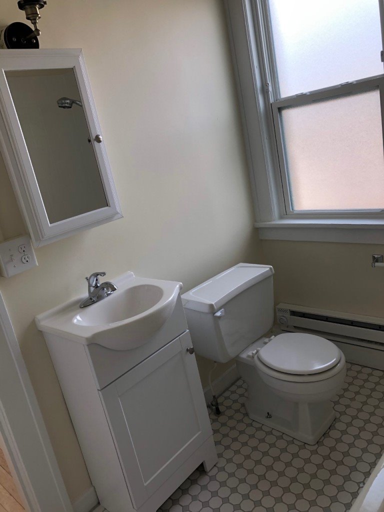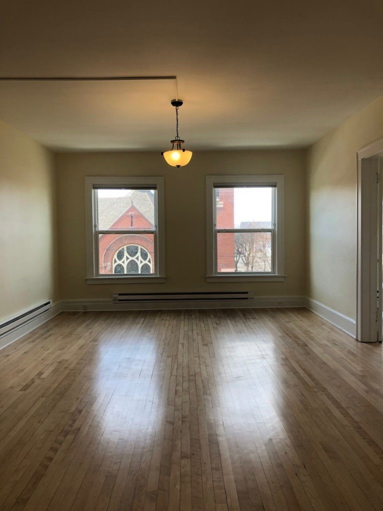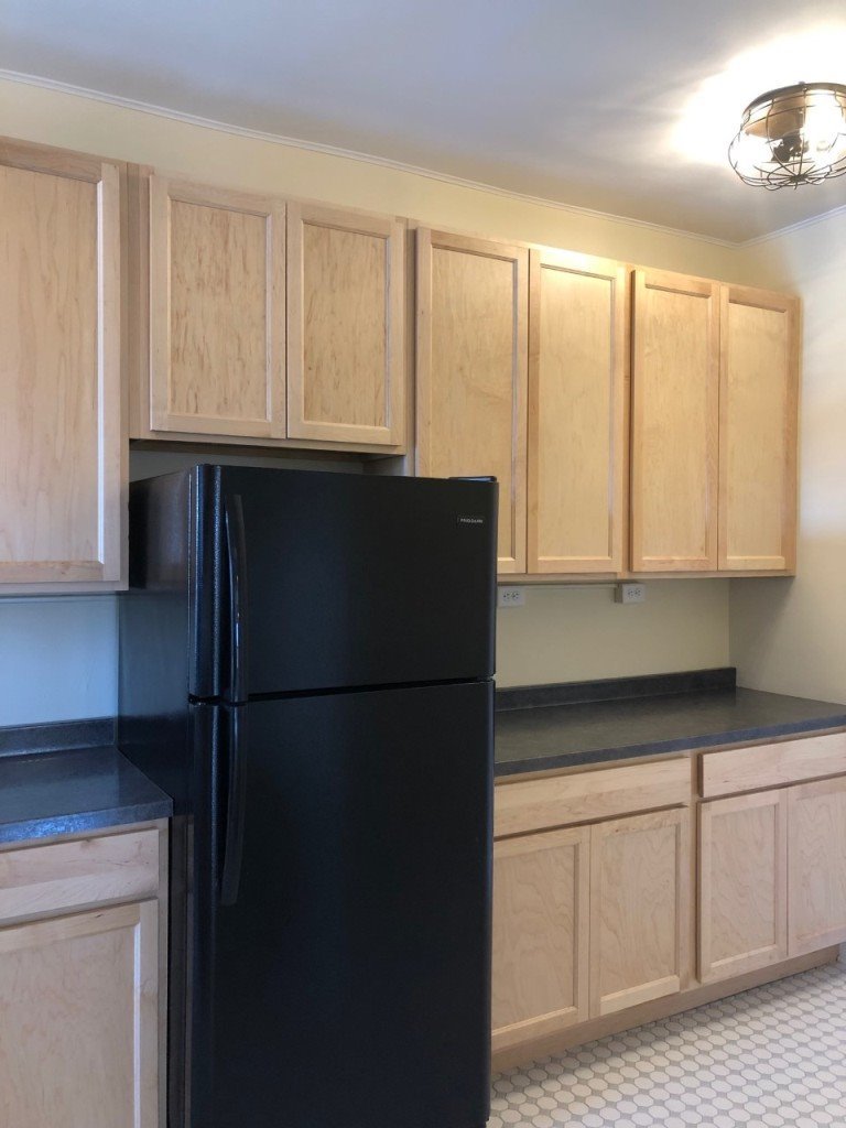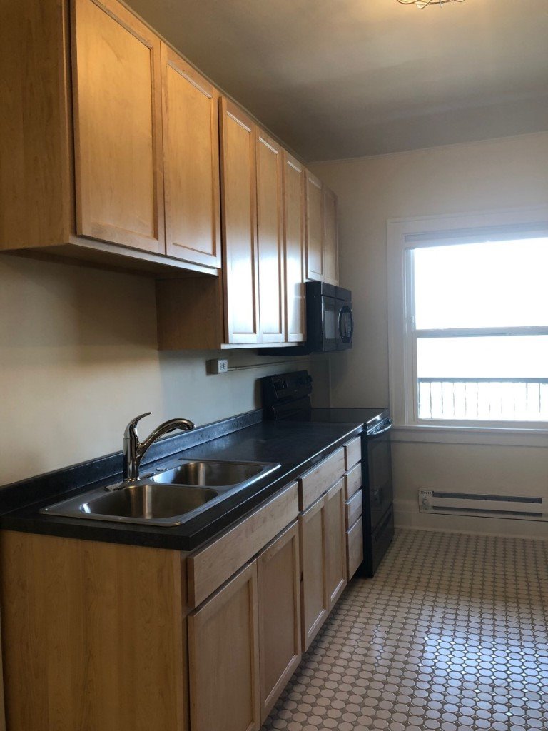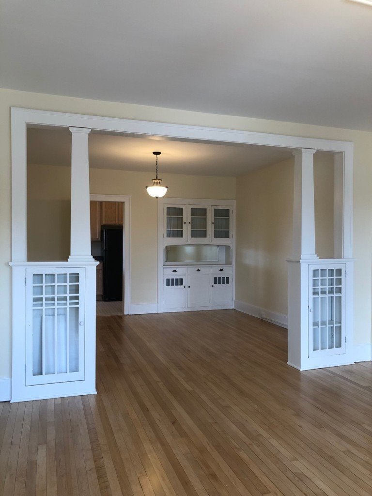 The units all have 2 bedrooms and a full Jack-and-Jill bathroom. The kitchens have brand new maple cabinetry and black appliances, the dining rooms offer built-in hutches for extra storage, and the bathrooms have original claw-foot tubs. Each unit has a front and back entrance and is pet-friendly with no additional fees.