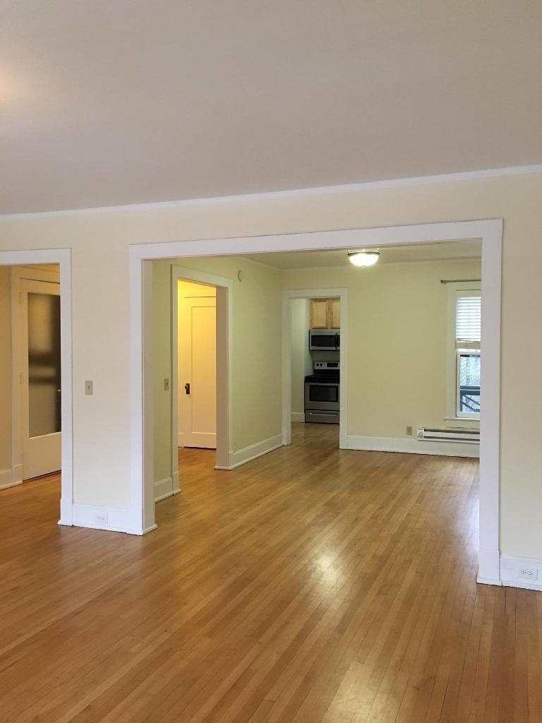 This particular main level unit is 1220 sq ft with 2 bedrooms on the main level, a huge living room, a formal dining area, a fully gutted and renovated kitchen, a charming renovated bathroom with gorgeous claw-foot tub, and many other character accents.